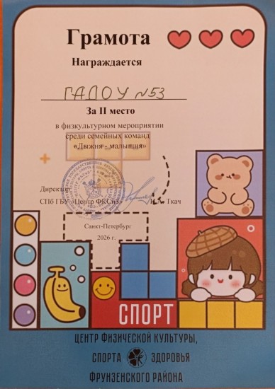 Воспитанница СПб ГАДОУ "Детский сад №53" Алиса М. получил Грамоту за 2 место в Районном дистанционном конкурсе «Спортивный Я»