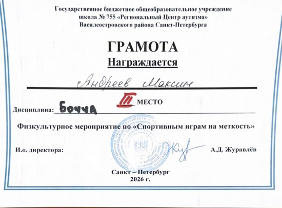 награжден Грамотой за 1 место